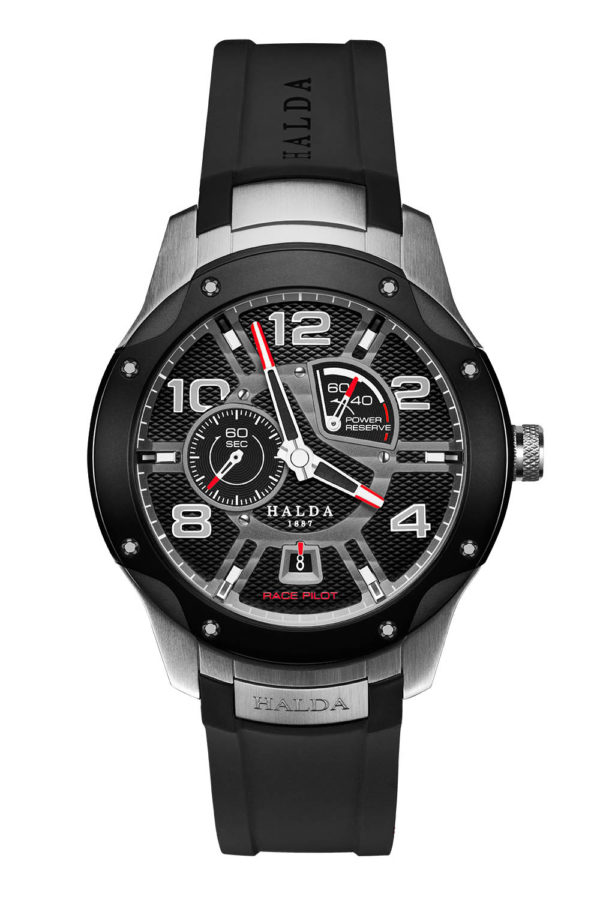 The Halda Race Pilot features a self-winding movement from ZENITH with date, sub-second and power reserve indicator. The 45mm case is processed out of titanium and finished with a black DLC coating and a bezel in stainless steel. It is built to withstand a pressure equivalent to 10 ATM (100 meters).